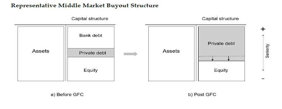 Il paper ci racconta che negli ultimi quindici anni il private debt, un tempo strategia di nicchia, è diventato uno dei pilastri dell’ecosistema finanziario globale. Dopo la Grande Crisi Finanziaria (GFC), il settore bancario ha subito una stretta regolamentare che ha ridotto la sua esposizione al credito ad alto rischio, soprattutto verso le imprese medio-piccole. Questo vuoto è stato colmato dai fondi privati, che hanno attratto capitali da investitori istituzionali alla ricerca di rendimenti più elevati in un contesto di tassi bassi. In sostanza, il ruolo di intermediazione delle banche in questo segmento è stato completamente occupato dalle non banche.