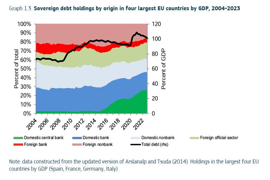 Se a questi soggetti aggiungiamo anche i soggetti finanziari non bancari, fondi pensioni, di investimento o altri, emerge (grafico sopra) che nei primi quattro paesi dell’Eurozona quasi il 60% del debito pubblico totale, che vale circa l’80% del pil, è tutto in pancia al sistema finanziario nazionale. Noi italiani ci distinguiamo per il peso relativamente più elevato del sistema bancario.