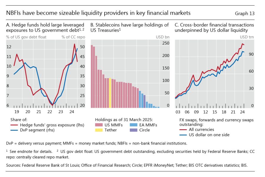 I fondi di private credit sono solo uno dei tanti esemplari che compongono l’assortita fauna delle Non banking financial institutions (NBFIs), che ormai da due decenni fanno il lavoro delle banche senza esserlo e che ormai sono diventate anche le grandi acquirenti dei titoli di stato. “Gli Hedge fund – scrive la Bis – sono sempre più diventate fonti di liquidità pro-ciclica, specialmente nel mercato dei bond governativi”. L’espressione liquidità pro-ciclica significa che forniscono tanta liquidità quando le cose vanno bene e ne richiedono altrettanta quando vanno male. Un meccanismo che abbiamo visto all’opera anche di recente.