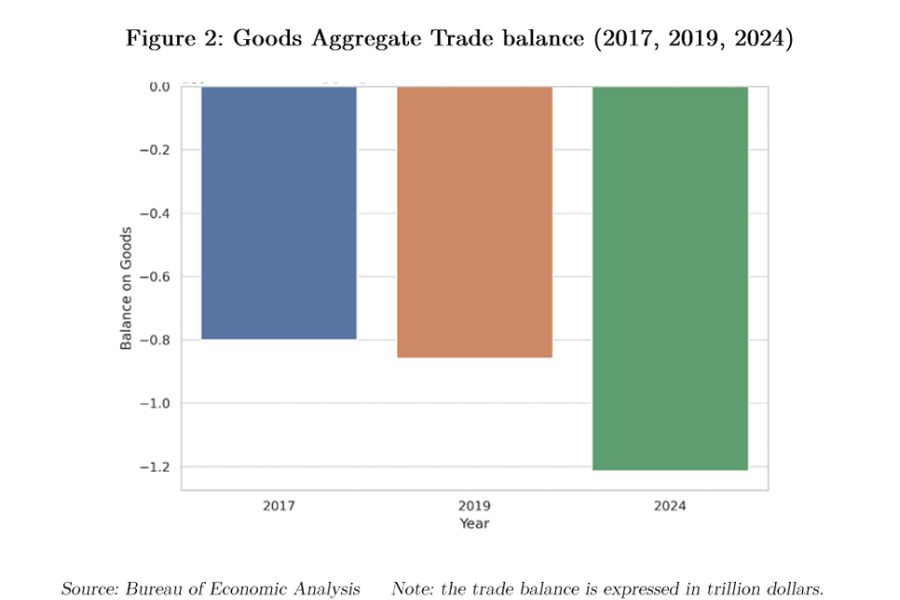Possiamo farcene un’idea più chiara leggendo un bel paper di Bankitalia dedicato proprio all’analisi macroeconomiche dei dati sull’economia americana, estrapolando dalla documentata ricognizione alcuni dati e riflessioni che ci aiutano a inquadrare meglio la questione. Prima però può essere utile una visione d’insieme sul deficit commerciale americano, che nella narrazione dell’amministrazione Usa è il motivo che giustifica la politica di dazi.