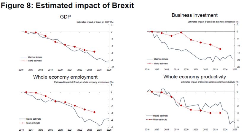 Vediamo qualche cifra. Il paper ha svolto sia valutazioni micro che macro economiche per paragonare l’andamento dell’economia britannica con alcuni paesi comparabili, tentando anche un esperimento controfattuale per stimare l’andamento dell’economia britannica senza Brexit.
