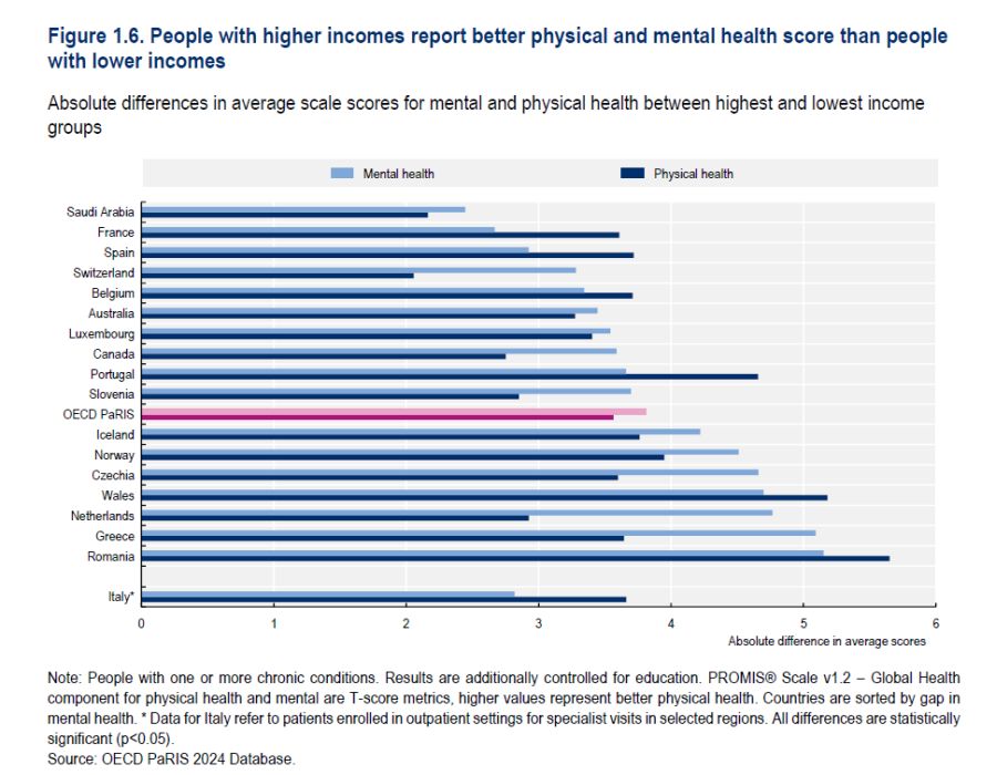 La figura sopra, riferita a diversi paesi, mostra che c’è una differenza che va dal 5 al 10% nella classifica della salute mentale fra chi ha un reddito più elevato rispetto a chi lo ha più basso, che rimane anche in caso di polimorbilità.