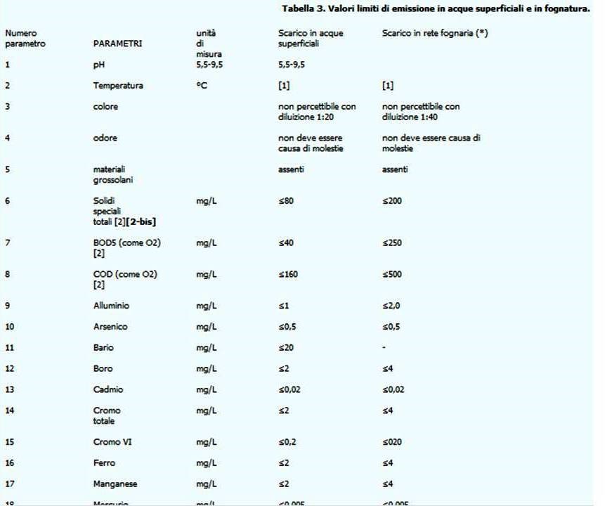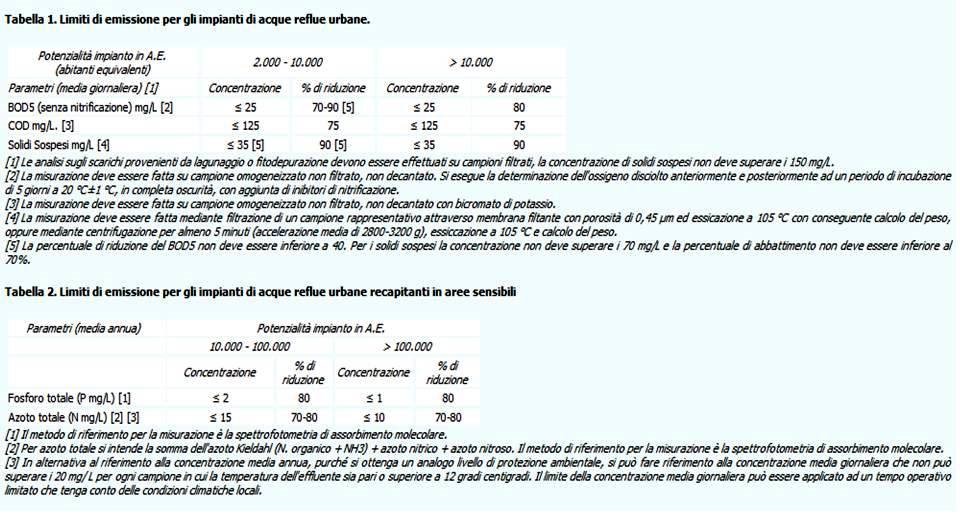 La tabella 1 si riferisce ad «acque reflue urbane» in impianti di depurazione di medio-piccole dimensioni, rispettivamente tra i 2.000 - 10.000 abitanti equivalenti e maggiori di 10.000 abitanti equivalenti. Per questi tipi di impianti, sono previsti criteri semplificati (BOD5, COD, e Solidi Sospesi). La tabella 2 si riferisce invece ad «acque reflue urbane in aree sensibili» e prescrive l’inclusione di due ulteriori parametri, fosforo totale e azoto totale. Poiché l’impianto di Lamezia è tarato per più di 100.000 abitanti equivalenti (fonte ASICAT), allora i limiti di legge per fosforo totale e azoto totale dovrebbero essere rispettivamente minori o uguali a 1 mg/l e minori o uguali a 10 mg/l. La tabella 3 prevede invece una lista di criteri molto più lunga, ma con valori limite decisamente più alti, considerato che si riferisce alle aree industriali. A titolo di esempio, nella tabella 2 il valore limite di fosforo totale è fissato a un livello “minore o uguale a 1 mg/l”, mentre nella tabella 3 è fissato a un livello “minore o uguale a 10 mg/l”. Dieci volte tanto. La domanda biochimica di ossigeno (BOD5) è invece fissata a un livello “minore o uguale a 25 mg/l” nella tabella 1, mentre è stabilita a un livello “minore o uguale a 250 mg/l” nella tabella 3. Cento volte tanto.