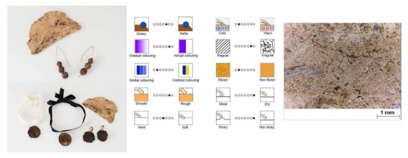 Nella foto si nota una vista d'insieme degli oggetti di bigiotteria, un'immagine al microscopio della superficie “legnosa” del materiale ottenuto ed una caratterizzazione espressivo-sensoriale effettuata sull'esempio di quanto investigato da ricercatori, come Elvin Karana della Technical University of Delft, in Olanda, per chiarire la “personalità” del materiale ottenuto.