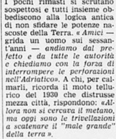 Rileggere la stampa di allora e in particolare il quotidiano locale Corriere Adriatico (il cui archivio è purtroppo andato disperso) propone la forsennata ricerca – allora come oggi – del responsabile a tutti i costi dei terremoti, identificato appunto nelle perforazioni per la ricerca di idrocarburi, a dispetto della lunga storia sismica della città di Ancona che aveva subito terremoti anche in tempi “non sospetti”. Nelle Figure 3 e 4 vengono proposti alcuni stralci, rispettivamente da La Stampa del 16 giugno e dal Corriere Adriatico del 7 agosto.