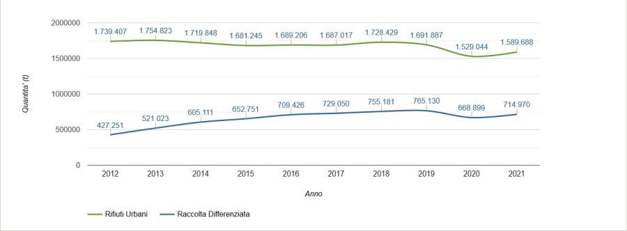 Rifiuti urbani nel comune di Roma – anno 2012-2021 (tonnellate)