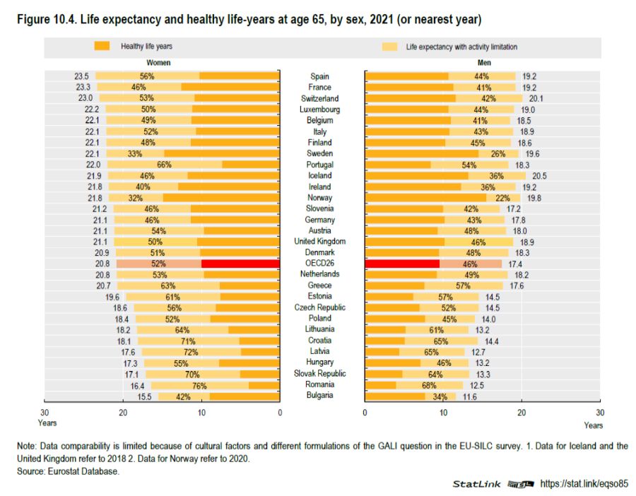 Purtroppo, questo dato non è disponibile per gli Stati Uniti nelle rilevazioni Ocse. Ma come secondo elemento di confronto possiamo prendere la Germania, che esibisce comunque una spesa sanitaria pari al 12,7% del pil, seconda solo a quella statunitense. In questo paese una donna 65enne nel 2021 ha una speranza di vita di 21,1 anni, il 46% dei quali, quindi una decina, si prevedono in cattive condizioni di salute. Per un uomo i numeri sono 17,8 anni di speranza di vita, il 43% dei quali in cattiva salute.