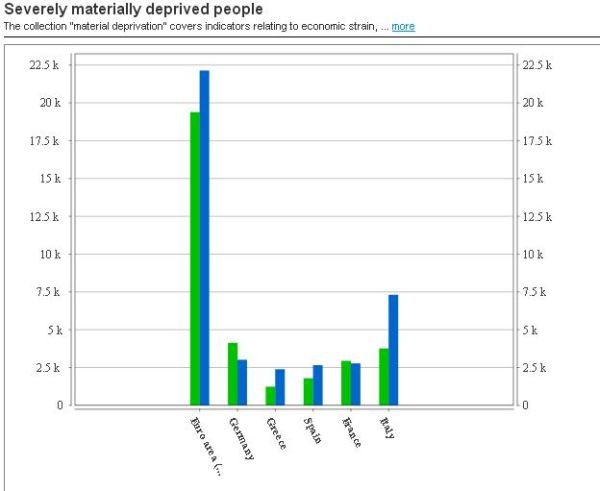 E tuttavia, parliamo sempre di medie. Se andiamo a guardare i dati Eurostat sul numero di persone che soffrono di gravi deprivazioni materiali, uno dei tanti indicatori che misurano i livelli di povertà, osserviamo che, sempre nel decennio considerato, le cose sono andate al contrario di quanto si potrebbe pensare osservando l’aumento della ricchezza netta. Nel senso che le famiglie sono più ricche, ma è aumentato il numero di quelli che sono poveri.