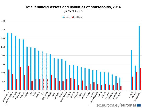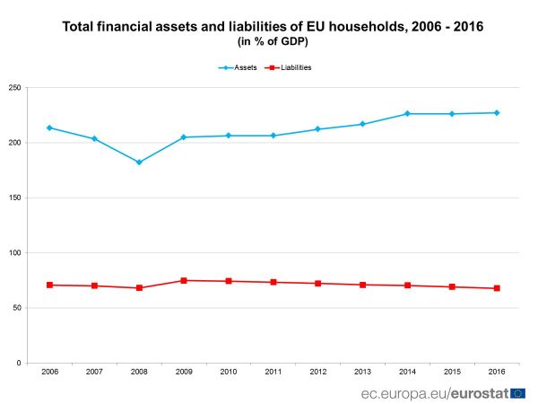 Come pretesto si può far riferimento agli ultimi dati diffusi da Eurostat sulla ricchezza delle famiglie dell’eurozona, nella sua accezione peculiare di ricchezza finanziaria al netto dei debiti. Il primo grafico contiene una buona notizia.