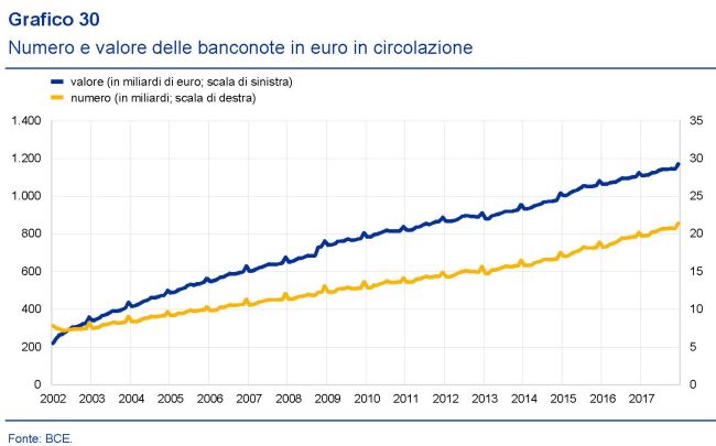 “Si stima – riporta il rapporto – che, in termini di valore, circa un terzo delle banconote in euro in circolazione sia detenuto al di fuori dell’area dell’euro. Si tratta soprattutto dei tagli maggiori, che sono detenuti principalmente nei paesi confinanti e sono utilizzati come riserva di valore e per il regolamento delle transazioni sui mercati internazionali”. Notate che le banconote da 500 euro, che la Bce ha smesso di produrre da maggio 2016, anche per il timore che favorissero transazioni illecite, sono state superate in valore solo di recente da quelle da 50 e sono state raggiunte da quelle da 100. Insomma: i grossi tagli che si vedono molto poco sono ancora molto utilizzati nei circuiti di pagamento.