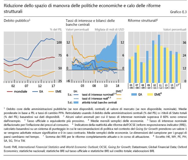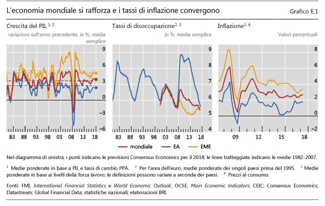 In sostanza, l’economia sta marciando bene. I tassi di crescita si sono allineati alla media di lungo periodo, la disoccupazione diminuisce e l’inflazione, grande preoccupazione dei policy maker, dà segnali di risveglio. Da qui il commento della Bri che invita ad “approfittare delle condizioni favorevoli per mettere in atto una combinazione di politiche più equilibrate volte a sostenere un’espansione sostenibile”, nella consapevolezza che “il sentiero che ci troviamo di fronte è stretto”.