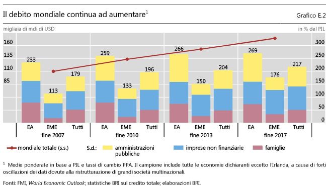 L’aggregato del debito complessivo nel 2007, pari al 179% del pil, è diventato il 217% a fine 2017, ma è soprattutto l’assortimento che fa la differenza. Le economie avanzate ormai sfiorano il 270% complessivo, ma sono soprattutto le economie emergenti che hanno visto crescere i propri debiti dal 113 al 176% del pil (+55%), grazie soprattutto al settore corporate e alle famiglie.