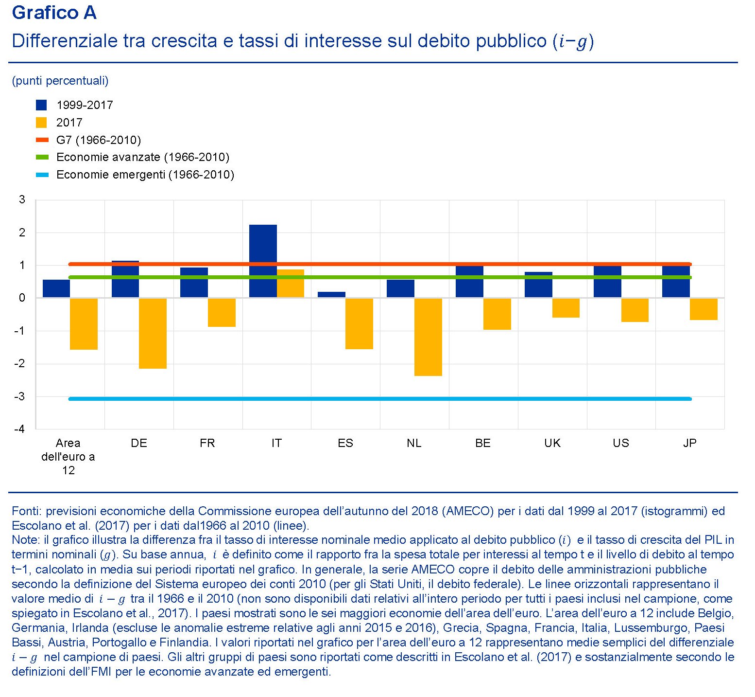 A fronte di questo quadro teorico, il paper di Blanchard ha avuto l’effetto di riaccendere la discussione e questo spiega anche l’interesse della Bce sul tema. Premesso che la modellistica comunemente utilizzata “non arriva a formulare conclusioni chiare riguardo al segno e alle dimensioni del differenziale tra crescita e tassi di interesse sul debito pubblico”, si può far uso di analisi empiriche che rilevano come “nelle economie avanzate mature il differenziale tra crescita e tassi di interesse, che rileva ai fini della dinamica del debito pubblico, si è mantenuto positivo per periodi più lunghi”. Proprio come osservato nell’analisi di Blanchard per gli Usa. Questo non vuol dire che sia stato così per tutti o costantemente, come si può osservare nel grafico sotto.
