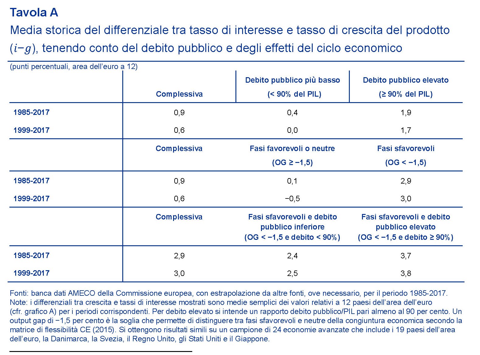 Nel corso di un anno, il debito pubblico di un paese aumenta in gran parte in ragione della somma pagata per gli interessi sul debito accumulato e del disavanzo primario, ossia la spesa in eccesso rispetto alle entrate al netto del pagamento degli interessi. Il cambiamento del debito in rapporto al Pil, di conseguenza, è determinato dal saldo primario e dalla differenza fra tasso di interesse e tasso di crescita. Ciò significa che se il differenziale fra tasso di interesse e tasso di crescita (𝑖 − 𝑔) è strettamente positivo, e quindi pago più interessi di quanto cresco, è necessario che il saldo primario generi un avanzo fiscale per stabilizzare o ridurre il rapporto debito pubblico/Pil.