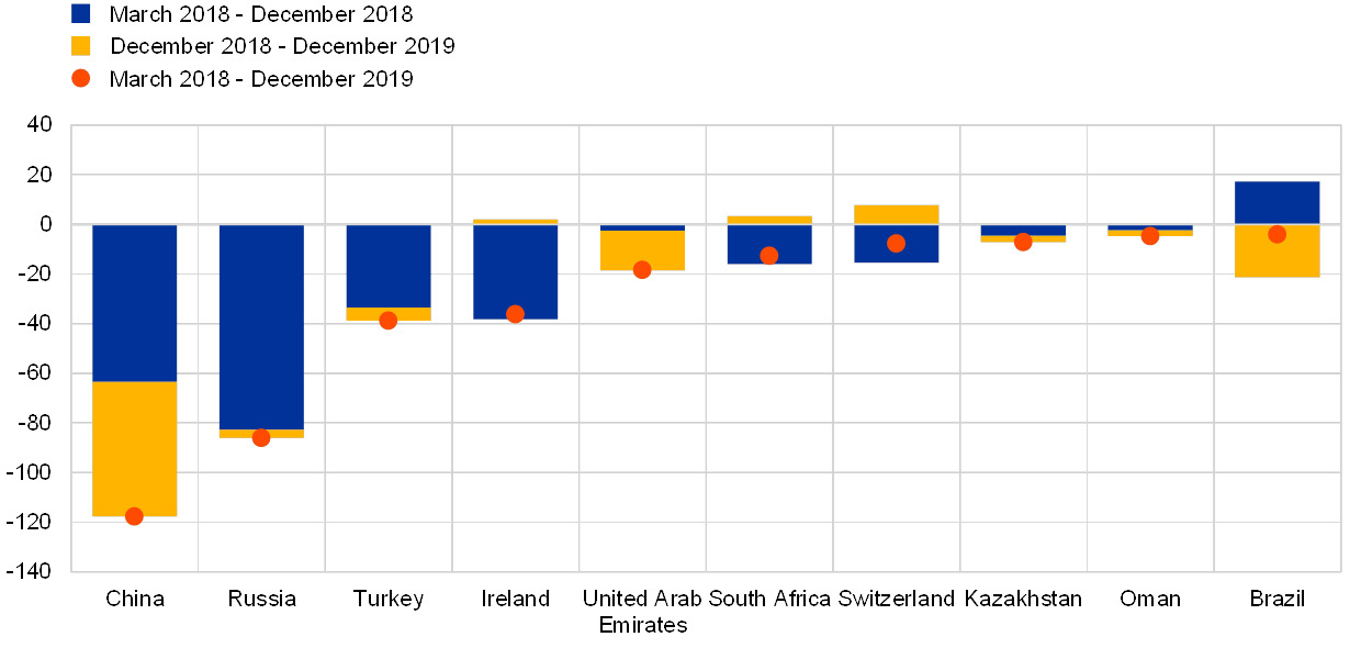 Insieme alla Cina, Mosca ha venduto 204 miliardi di dollari di Treasury nel corso del 2018. E questo movimento è proseguito anche nel 2019, con almeno 54 miliardi di titoli Usa venduti dai Cinesi, che porta il totale ad oltre 120 miliardi per la Cina e a quasi 100 per Russia. Quest’ultima, però, nel 2019 ha rallentato molto le sue vendite, limitandole ad appena 3 miliardi.