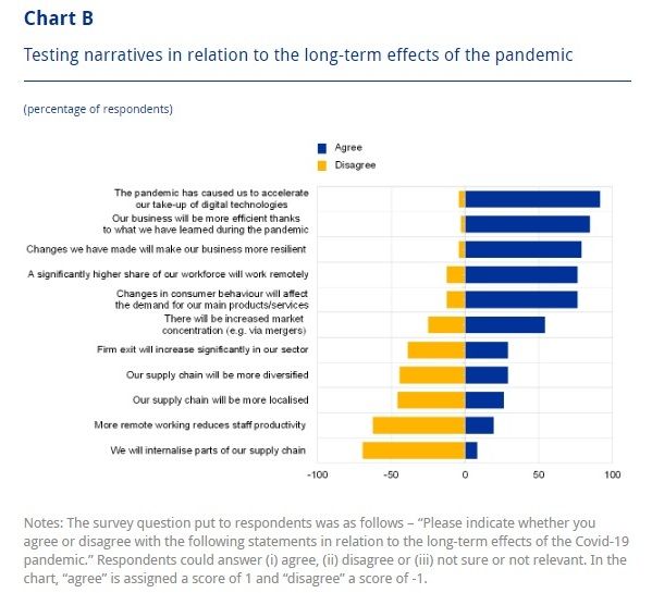 Come si può osservare, fra gli effetti di lungo termine che convincono il maggior numero dei partecipanti, c’è un uso maggiore del lavoro da remoto. Le imprese, quindi, sono convinte che questa nuova forma di lavoro, che si è diffusa enormemente a causa della pandemia, rimarrà con noi a lungo. La qualcosa non sorprende, visto che il lavoro remotizzato piace ai lavoratori, ma conviene anche ai datori di lavoro.