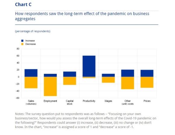 Il 60% degli intervistati crede che la produttività aumenterà. Un’aspettativa positiva che compensa quell’oltre 50% che si aspetta un calo permanente dell’occupazione, probabile conseguenza del calo delle vendite, che si ripercuote sul livello delle retribuzioni e dei prezzi, entrambi visti in ribasso.