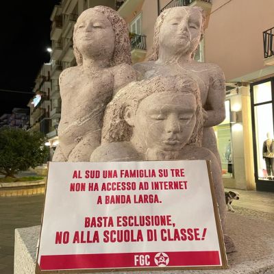 La FGC sottolinea che “In Italia circa 34.000 studenti sono a rischio abbandono scolastico, numeri che aumentano esponenzialmente al sud, dove solo il 25% degli studenti è riuscito a seguire con costanza le lezioni online e dove una famiglia su tre non ha accesso ad internet a banda larga”.