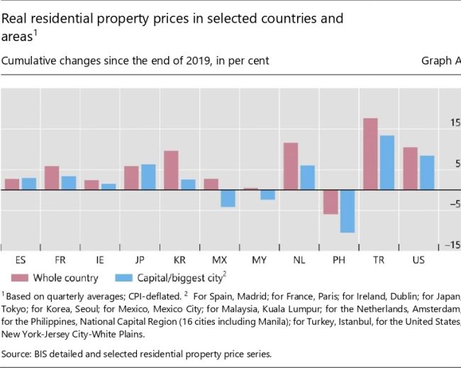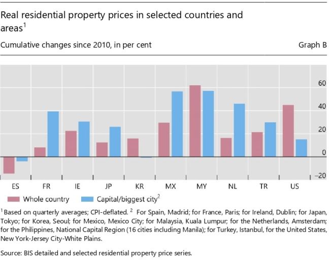 La Bis osserva che l’inflazione dei prezzi del mattone, che abbiamo già osservato, è stata meno pronunciata nelle grandi città rispetto alle aree esterne. Sui 21 paesi osservati, tale tendenza si è osservata in 11 capitali/grandi città, mentre in altre cinque si è osservata la tendenza opposta. Si tratta quindi di un’evidenza molto sfumata. Ma definita abbastanza da meritare un approfondimento.
