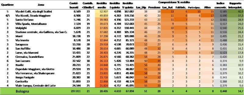 A Bologna il reddito medio è relativamente alto, ma rispetto alle altre città le differenze sono meno marcate, sia per l'intera città che per le singole zone. I redditi medi più alti si trovano in via dei Colli, via degli Scalini (quartiere Santo Stefano), e nella zona centrale di via Rizzoli e strada Maggiore; quelli più bassi sono nella periferia di viale Europa, centrale del latte Granarolo (quartiere San Donato-San Vitale) e Corticella (quartiere Navile).