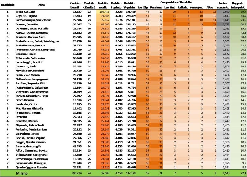 A Milano la distribuzione della popolazione per censo è assai netta: i redditi più alti si trovano al centro (I municipio), dove superano in media i 100 mila euro a Brera-Castello, nonchè a City Life nell’area ex-Fiera (quartiere Portello del municipio 8); quelli più bassi a Quarto Oggiaro e Roserio (meno di 20 mila euro).