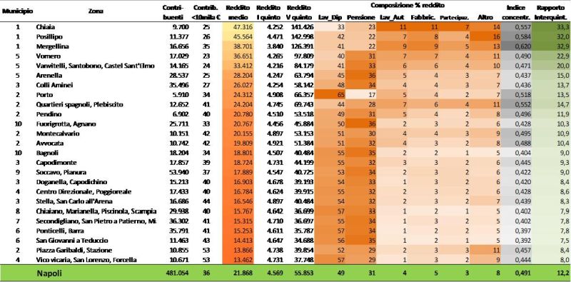 Anche a Napoli i redditi più alti si registrano nei quartieri centrali di Chiaia, Posillipo e Mergellina (municipio 1), oltre che al Vomero, ma non raggiungono in media i 50 mila euro; quelli più bassi a Vico vicaria-San Lorenzo- Forcella (municipio 4) e nella zona della stazione ferroviaria.