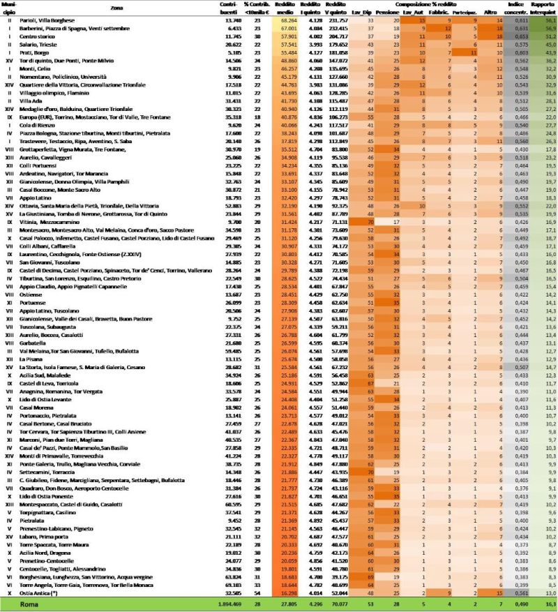 A Roma i redditi medi più alti, superiori ai 50 mila euro, si registrano ai Parioli e nelle zone del centro del I e II municipio, mentre i redditi più bassi si trovano in periferia del V e VI municipio, dovendo escludere dall'analisi il dato di Ostia Antica (X municipio), dove più della metà dei contribuenti ha un reddito inferiore ai 10 mila euro, un valore che non appare plausibile.