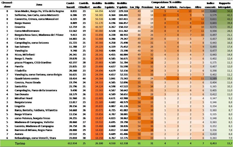 A Torino i quartieri benestanti si trovano in prevalenza nelle circoscrizioni 1 e 8 della città e quelli più poveri nelle circoscrizioni 5 e 6 e nella zona di Aurora (circoscrizione 7) che confina con il centro. Una quota elevata di contribuenti al di sotto dei 10 mila euro è presente al Quadrilatero centro (44%) ed è più bassa a Corso Mediterraneo (19%).