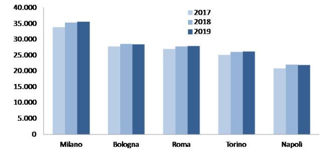 Redditi lordi nelle principali città italiane, anni 2017-2019 (valori medi in euro)