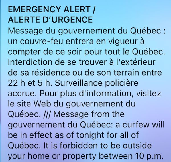 Dopo Natale, che è stato possibile festeggiare insieme ad un massimo di 6 persone, è arrivata la stretta temuta: cene permesse alla bolla familiare residente, un invito possibile ad un massimo di una persona sola, dal 31 dicembre coprifuoco dalle 22 alle 5, chiusura ristoranti e locali pubblici, chiusura di tutti i negozi la domenica. Oltre il consueto annuncio in tv, è arrivata una notifica su tutti i cellulari presenti in Québec.