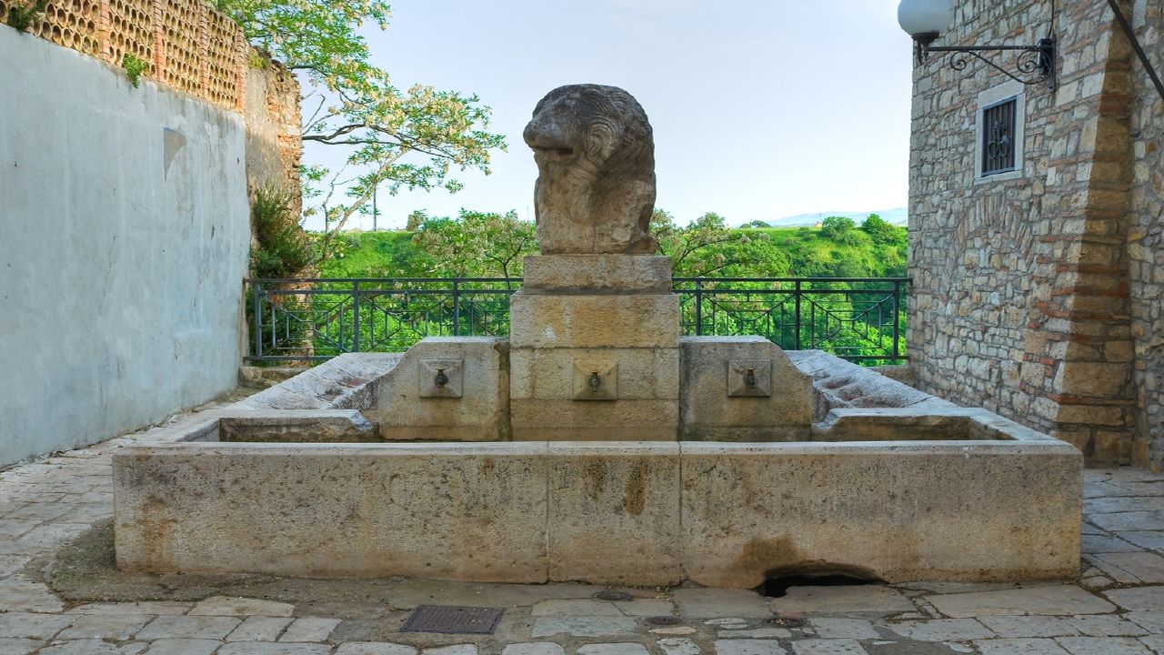 Ancora un po’ e il regista inaspettatamente mi tuffa in un ricco ampio scenario con a sinistra la baroccheggiante Chiesa di San Filippo Neri e di fronte il Castello Aragonese, oggi Museo archeologico, difeso da torri e ampio fossato. A destra, palazzi padronali con porticati e bar vecchio stile mi accompagnano alla lunga Fonte Angioina, aperta e chiusa da due leoni in pietra come tutta l’opera. Poco fuori dell’abitato, le catacombe ebraiche, il villaggio abbandonato di Sanzanello, con la chiesetta e le masserie rupestri.