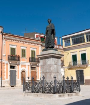 Ammirando, oltre a palazzi e cortiletti nell’interno a sinistra e a destra, la fontana di Messer Oto custodita dal Leone, che è di casa a Venosa, di fronte due figure in pietra di notabili romani. E lo storico Palazzo del Baliaggio con la sua lunga, antica storia. Proseguendo, botteghe di artigianato, motti oraziani su targhe murali lungo la via. Orazio, a seguire, si ruba la scena con la sua statua in un’ampia luminosa piazza.