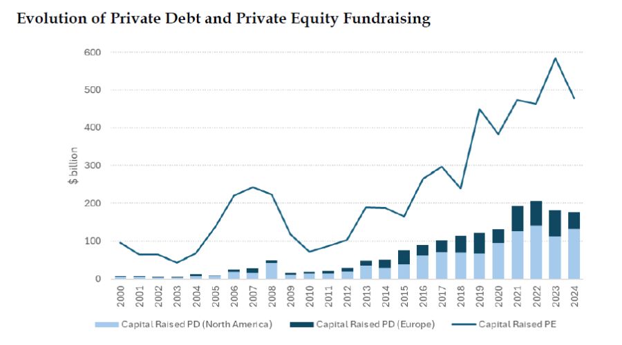 Il risultato è stato che nel 2025, il mercato globale del debito privato ha raggiunto 1,7 trilioni di dollari in capitale impegnato, triplicando rispetto al decennio precedente. Circa un terzo di questo capitale non è ancora stato investito, segno di una forte capacità residua.