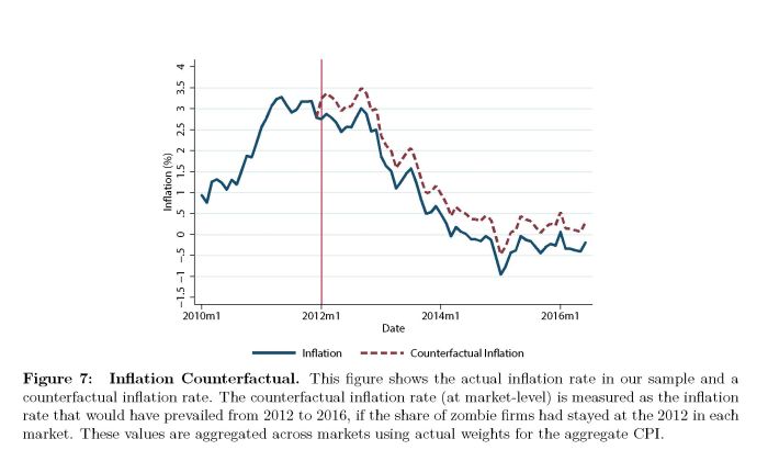 Da qui, l’esercizio controfattuale sui livelli di inflazione che si sarebbero ottenuti se le imprese zombie fossero rimaste allo stesso livello del 2012, invece di crescere notevolmente come accaduto, ad esempio, in Francia, dove solo nel settore manifatturiero si è avuto un aumento del 38,5% della quota di queste imprese.