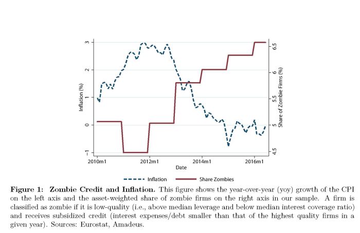 La conclusione è arrivata dopo aver esaminato un ampio pannello di dati riferiti a diversi settori di una dozzina di paesi europei dal quale si è dedotto che il credito alle aziende zombie fa decrescere insieme al tasso di insolvenza, che è un fatto sicuramente positivo, anche i prezzi alla produzione e la produttività, specie se guardiamo dallo spioncino della banca centrale.