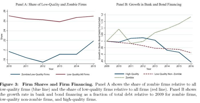 In sostanza, a partire dal 2012 è aumentata la quota di imprese zombie sul totale di imprese poco efficienti, mentre queste ultime sono leggermente cresciute rispetto al totale delle imprese. Al tempo stesso, è aumentata significativamente la quota di credito che le banche hanno destinato alle imprese zombie, a differenza di quanto accaduto a quelle di alta qualità. Comportamento comprensibile: le banche hanno potuto usare il credito a basso costo, innanzitutto per salvare le aziende verso le quali erano probabilmente più esposte. Ma poiché le risorse non sono illimitate, ciò ha comportato che le imprese più efficienti hanno avuto meno accesso a risorse. Ed ecco spiegato perché ne abbia risentito la produttività.