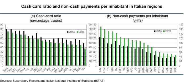Bankitalia nota che nel periodo considerato “la domanda di contante a fini di transazione misurata dal rapporto cash-card è diminuito in tutte le regioni italiane”, anche se nel Meridione questo rapporto “è rimasto sostanzialmente più alto della media nazionale”.