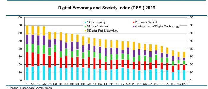 Ma quello che vale per il Sud si può dire valga per l’intero paese quando si confronta con i partner europei. E non è certo un caso che la nostra posizione di fanalini di coda nell’uso di sistemi di pagamento alternativi coincida con un posizionamento altrettanto basso nell’indice di digitalizzazione del paese, come mostra il grafico sotto.