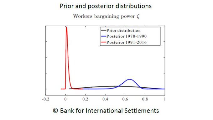 Il lavoro pubblicato dalla Bis prende un’altra strada, che risulta perfino più suggestiva. Proviamo a semplificare il concetto (gli autori mi scuseranno): non è la quantità di lavoro in sé, a determinare il funzionamento della curva di Phillips, ma la capacità contrattuale della classe dei lavoratori a determinare la causazione. Detta diversamente, non è tanto la quantità di lavoratori a disposizione che determina l’inflazione, ma la qualità dei lavoratori, intesa come capacità di avere voce in capitolo nei contratti.