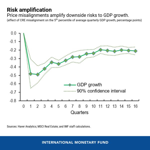 Nell’esempio fornito dal Fondo, un calo di 50 punti base del tasso di capitalizzazione degli immobili rispetto al suo trend di lungo periodo può generare un rischio per la crescita di 1,4 punti di pil nel breve termine, che diventano il 2,5% nel medio.