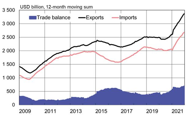 Il 2021, ci ricorda un pregevole post di Bofit, è stato l’anno dei record per il surplus commerciale cinese, che ha esportato 3,37 trilioni di dollari di merci, il 30% in più dell’anno prima, che certo è poco indicativo per le note ragioni pandemiche.