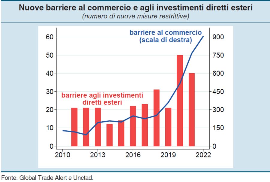 Le ultime considerazioni finali del governatore Ignazio Visco, da questo punto di vista, sono una lettura assai istruttiva. L’analisi del contesto internazionale, che non è buono per i noti motivi, conduce alla conclusione che “l’emergere di fratture nelle relazioni internazionali può avere effetti duraturi, influenzando le strategie aziendali di lungo periodo, incluse quelle di localizzazione delle produzioni”. Una tendenza che si rispecchia nell’aumento significativo delle restrizioni al commercio che ha caratterizzato gli ultimi anni (grafico sopra).