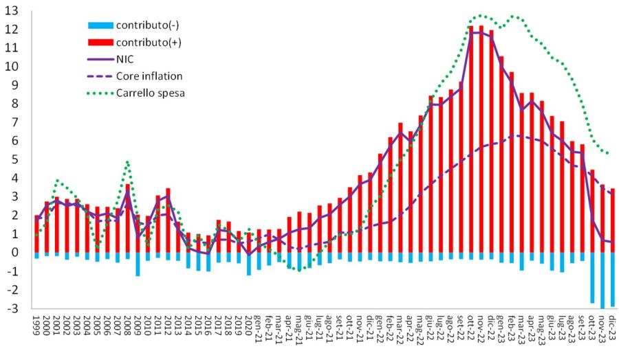 Fortunatamente, a fine anno sia l'inflazione (+0,6%), sia la componente di fondo (+3,1%) sembrano aver imboccato un sentiero di discesa, anche se il carrello della spesa resta pur sempre a +5,3% tendenziale.