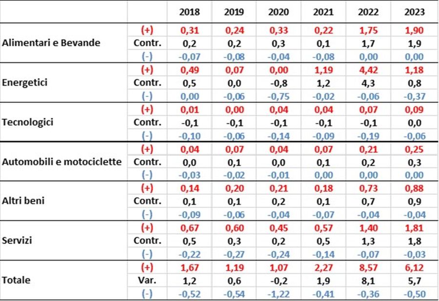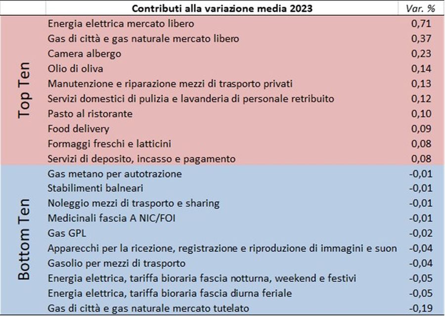 L'aumento dell'inflazione nel 2023 è attribuibile per oltre 1 punto percentuale al mercato libero dell'energia elettrica e del gas, ma crescono anche i prezzi di alberghi e ristoranti e di alcuni servizi (manutenzione auto, domestici, bancari). Il contributo negativo è ascrivibile principalmente ad alcune componenti tariffarie delle bollette di luce e gas, carburanti per autotrazione, beni tecnologici.