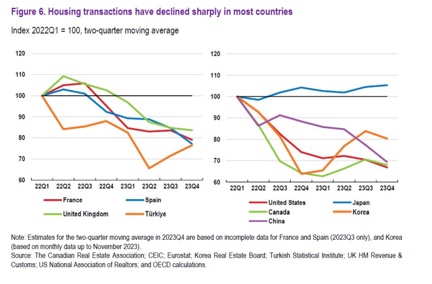 Son tempi magri per chi vuol vendere casa. Il crollo delle transazioni certificato da Ocse, con la notevole eccezione del Giappone, ci racconta di una bolla gonfiata dai soldi facili che molto rapidamente si sgonfia, e speriamo senza fare troppi danni, adesso che i soldi sono tornati difficili.
