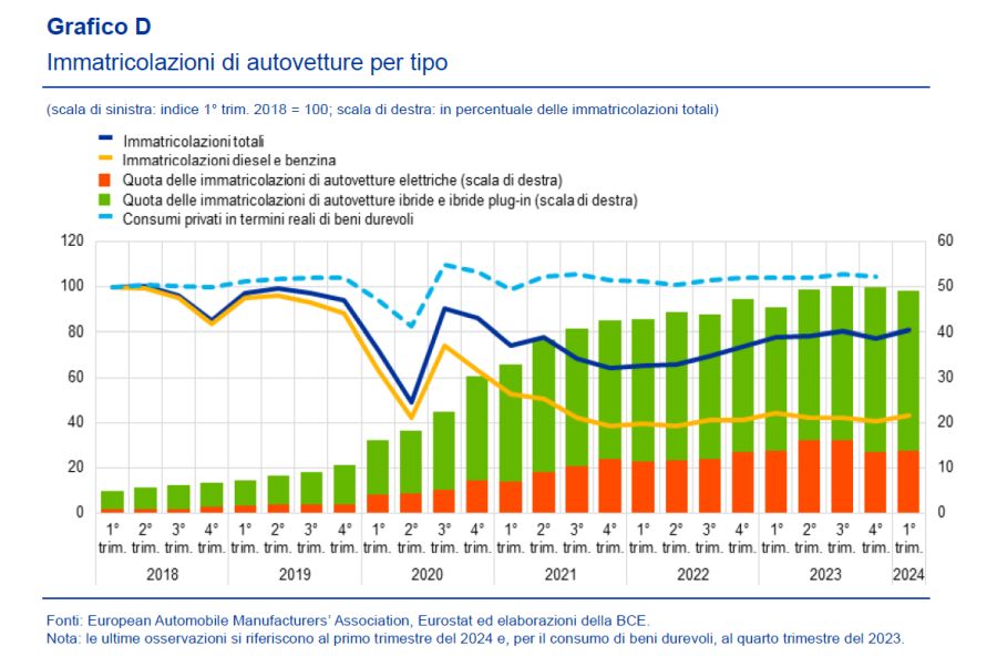 Molto di questi andamenti si spiegano con la graduale ma costante disaffezione dei consumatori (e delle norme che ne regolano la produzione) verso i motori a combustione. I veicoli ibridi, ad esempio, che erano un decimo del venduto nel 2018 l’anno scorso erano arrivati a pesare il 50% delle immatricolazioni. E il 2024 si è aperto con un calo del 20% delle immatricolazioni di auto, unico bene durevole verso il quale le famiglie sembrano attendiste. Forse perché sul futuro del settore pesa una notevole incertezza. Forse perché il costo delle auto è elevato.