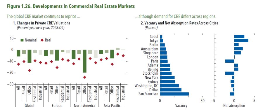 Il Fmi osserva che questi andamenti risentono ancora del cambio di paradigma nel mercato del lavoro che si è imposto con l’avvento del lavoro da remoto indotto dalla pandemia, che però ha generato effetti molto diversi a seconda delle aree considerate. Le aree metropolitane statunitensi, ad esempio, esibiscono i livelli più elevati di immobili inutilizzati (vacancy rate) rispetto ad altre realtà, mentre gli sviluppi dell’intelligenza artificiale fanno ipotizzare l’aumento della domanda di immobili destinati ad ospitare data center, specie nell’Asia-Pacifico.