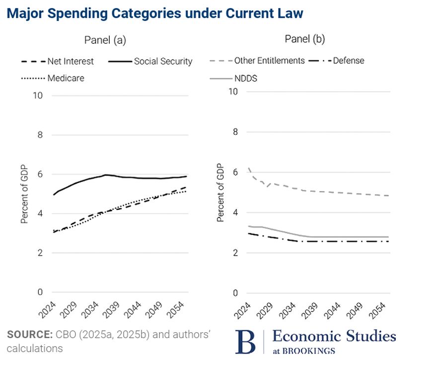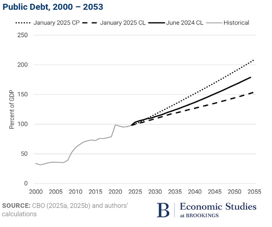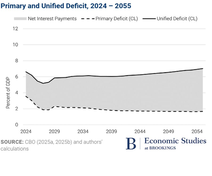Staremo a vedere. Nel frattempo è utile farsi un’idea della situazione. L’outlook più aggiornato sui conti pubblici statunitensi lo ha pubblicato di recente l’Istituto Brookings, ed è una lettura consigliata a tutti coloro, e sono tanti, che pensano che il debito pubblico non sia un problema. Qui prenderemo in esame solo alcuni elementi che servono a tratteggiare una tendenza di lungo periodo che, a legislazione vigente, vede il debito pubblico Usa al 118% del pil già nel 2035, record storico, grazie al costante alimento di un deficit alto e persistente alimentato da uno sbilancio primario costante, intorno al 2% del pil, cui si somma una spesa per interessi che si prevede arriverà al 4,1%, sempre nel 2025, dal 3,1% di oggi. Un altro record storico, che si somma a quello del deficit.