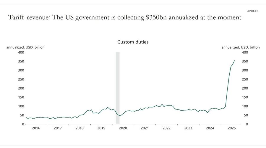 La curva che vedete impennarsi (grafico in basso) misura l’aumento delle entrate fiscali da dazi osservate di recente negli Stati Uniti.