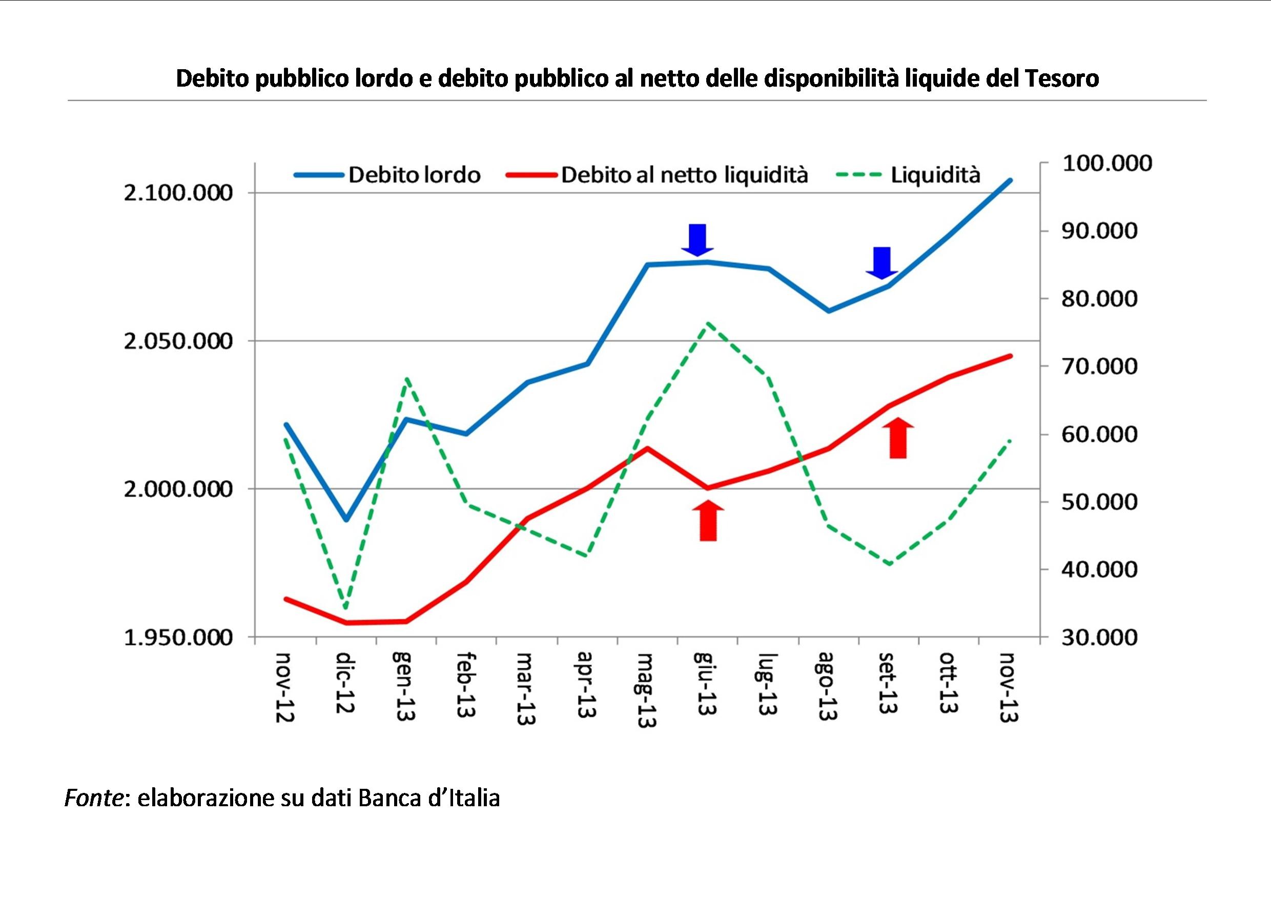 Ma cosa è accaduto in realtà? A maggio 2013, il Governo decise di mettere un po’ di fieno in cascina, ovvero di aumentare la disponibilità di cassa. Per mettere soldi da parte il Tesoro, a fronte di un fabbisogno dello Stato di appena 8,8 miliardi di euro, emise titoli di Stato in quantità di gran lunga superiore, facendo crescere il debito pubblico di 33 miliardi. Nei mesi successivi ha, invece, provveduto a ridurre la liquidità accumulata. La figura allegata ci mostra le due facce della stessa medaglia.